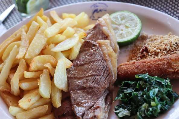 • 🔥 Pincanhas de bœuf : servies en tranches épaisses, légèrement rosées, avec farofa, banane frite et une touche de citron vert. La viande est juteuse, bien saisie, et le plat s’inscrit dans une tradition de grillade lusophone, entre Brésil et Angola.