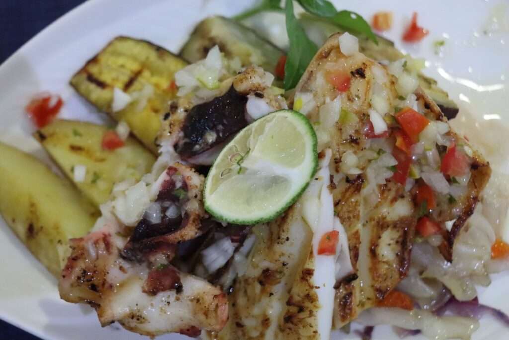 Lors de notre passage à l’hôtel Chimbidja, à Ondjiva, nous avons eu le plaisir de déguster un poulpe grillé qui allie tradition et raffinement. Servi sur un lit de légumes grillés — aubergines, pommes de terre, courgettes — et garni d’un hachis d’oignons, de poivrons rouges et d’herbes fraîches, le plat était couronné d’une fine tranche de citron vert. Chaque bouchée offrait un équilibre parfait entre le moelleux du poulpe et le croquant des légumes, entre l’acidité du citron et la douceur des aromates.