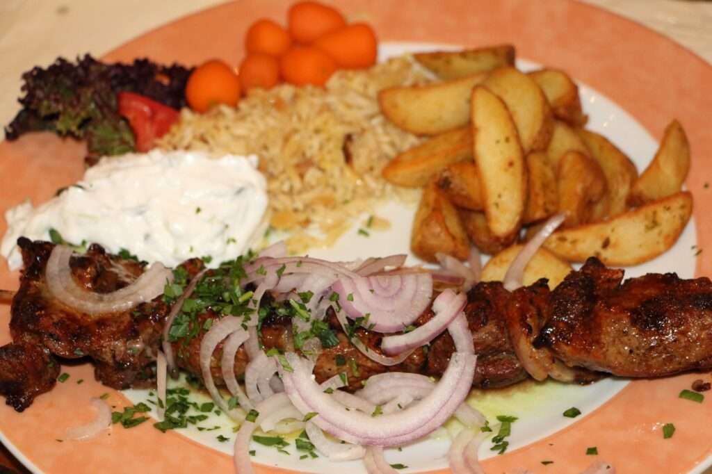 Autour, l’assiette raconte la Grèce dans ce qu’elle a de plus immédiat et rassurant : des quartiers de pommes de terre dorés, croustillants à l’extérieur, moelleux à cœur ; un riz pilaf discret mais parfumé, absorbant les sucs de la viande ; une généreuse cuillerée de tzatziki, fraîche et légèrement aillée, qui apporte contraste et douceur. Quelques légumes simples — tomates cerises, salade verte — viennent équilibrer l’ensemble sans jamais voler la vedette à la brochette.