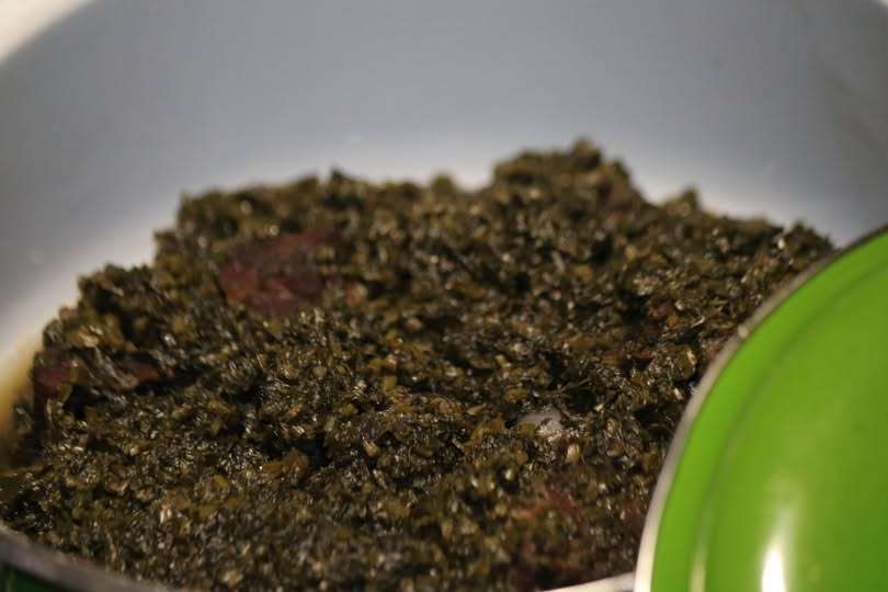 Les feuilles de manioc apportent une légère amertume qui équilibre parfaitement la richesse de la sauce. Parfois, des morceaux de poisson ou de viande comme ici du boeuf sont ajoutés pour compléter le repas, apportant une source supplémentaire de protéines et de saveurs.