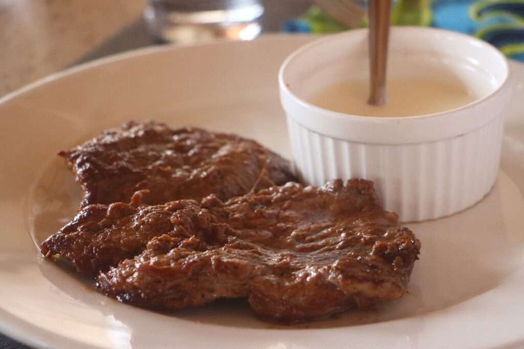 Lorsqu’elles arrivent à notre table, nous constatons qu’elles sont tendres, copieuses et délicieusement goûteuses. Les brochettes sont servies avec une sauce au poivre et une autre aux oignons confits, qui ajoutent une profondeur de saveur irrésistible. Chaque bouchée est un vrai régal, et nous ne pouvons nous empêcher d’apprécier la générosité des portions.