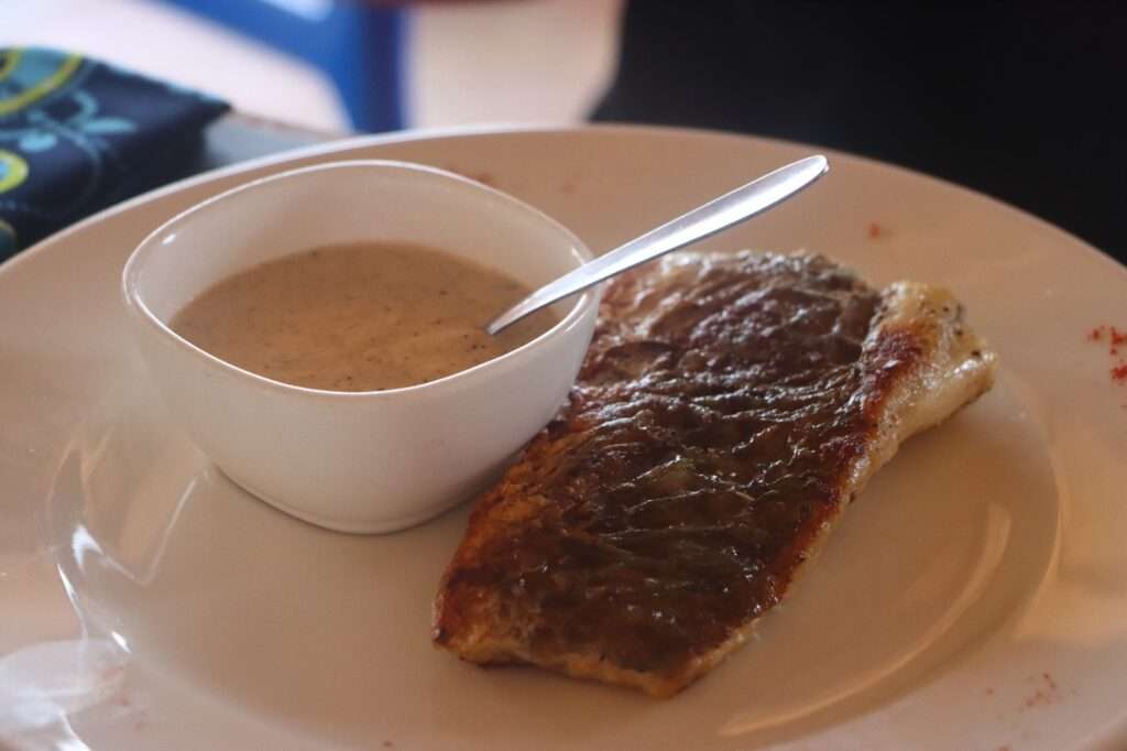 La cuisine y est traditionnelle, et la carte, bien que peu variée, tourne principalement autour de la volaille et du poisson. Lors de notre visite, nous avons eu le plaisir de goûter au kedjenou de volaille, un plat traditionnel ivoirien. Le kedjenou est un ragoût de poulet mijoté lentement avec des légumes et des épices, généralement cuit dans une cocotte fermée, ce qui permet à la viande de s’imprégner des arômes et de rester tendre et savoureuse.