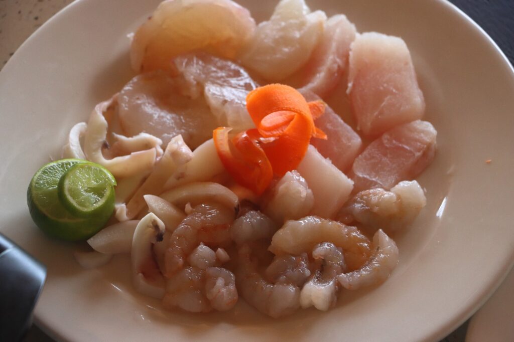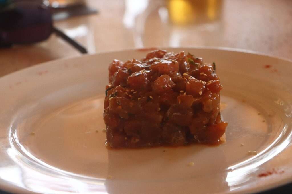 En parcourant le menu, nous décidons de tester du Saint-Pierre, un plat que nous ne nous attendions pas à trouver ici. Cependant, à notre grande déception, le serveur nous informe qu’il n’y en a pas aujourd’hui. Nous réfléchissons alors à nos options et nous nous rabattons sur des brochettes de bœuf, qui s’avèrent être un excellent choix.