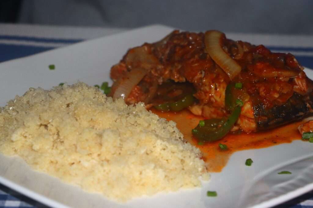 L’attieke est préparé en râpant le manioc fermenté, puis en le cuisant à la vapeur jusqu’à ce qu’il soit léger et moelleux. Pour accompagner ce plat, le thon est généralement grillé ou cuit à la poêle avec des épices, des oignons, des tomates et des poivrons, créant une sauce savoureuse et parfumée. Cette combinaison de manioc et de poisson est souvent agrémentée d’une salade de crudités et d’une sauce piquante pour rehausser les saveurs.