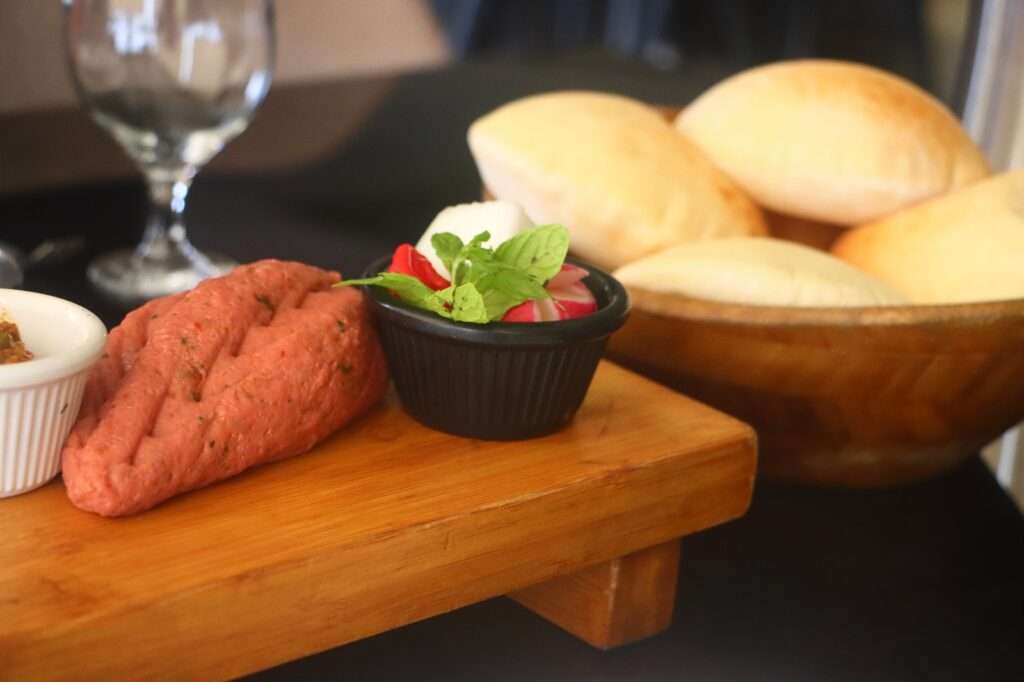 Pour plus de fraîcheur, le tartare de bœuf TEEBLE est succulent, accompagné de pain libanais soufflé, de cornichons, oignons, piment, et d’une sauce aux tomates confites excellente. Chaque plat est préparé avec soin, offrant une explosion de saveurs. Cette étape gastronomique est une véritable satisfaction pour les sens. Nous profitons pleinement de ce moment agréable, en savourant des mets raffinés tout en admirant le panorama magnifique. C’est une expérience qui nous fait du bien, alliant une cuisine exquise à un cadre enchanteur.