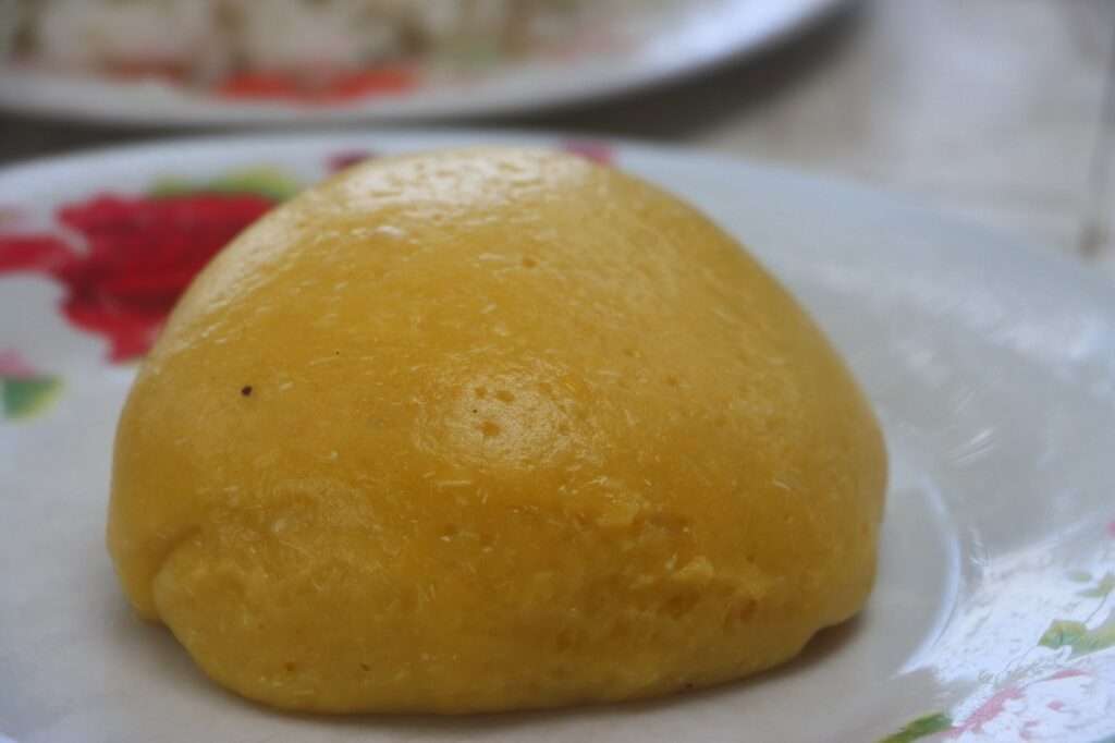 Le Foutou Banane est préparé à partir de bananes plantains et de ignames. Ces ingrédients sont soigneusement bouillis, puis écrasés et travaillés jusqu’à obtenir une texture lisse et élastique. Ce processus, bien que laborieux, est essentiel pour obtenir la consistance parfaite du foutou, qui se doit d’être à la fois tendre et consistant.