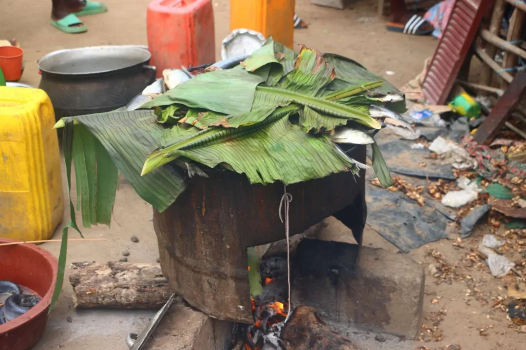 Tout commence par la préparation minutieuse des poissons, souvent des tilapias ou des capitaines. Les villageois les nettoient soigneusement et les éviscèrent, parfois les laissant entiers, parfois les découpant en filets selon leur taille. Ensuite, les poissons sont marinés ou assaisonnés avec un mélange d’épices, de sel, et parfois de jus de citron ou de vinaigre. Les ingrédients typiques de ces marinades incluent l’ail, le gingembre, le piment et des herbes locales, ajoutant des couches de saveur.