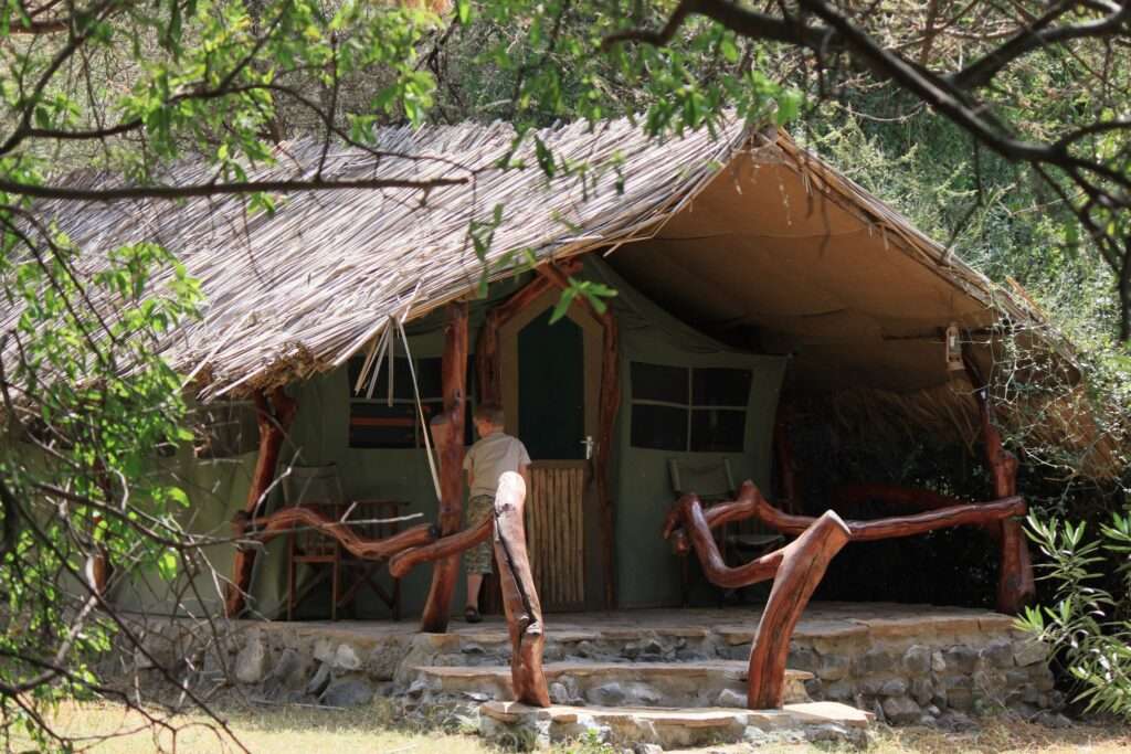 Alors que nous posons nos bagages, un souffle d’air chaud traverse la tente. Dehors, le soleil décline doucement et fait danser des reflets dorés sur le bois sculpté des rambardes. À quelques pas seulement, la rivière forme de petites piscines naturelles où les plus téméraires vont se rafraîchir après la route. Nous restons un instant à écouter ce silence vibrant, ponctué par le chant d’oiseaux et le tintement lointain des clochettes attachées au cou des chèvres masaï.