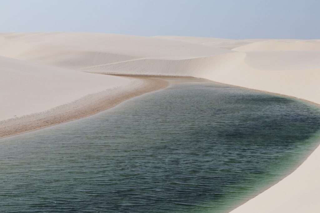Les Lençóis Maranhenses résultent d’un dialogue complexe entre vents marins, apports fluviaux et pluies saisonnières. Le sable, essentiellement quartz clair issu de l’érosion continentale et transporté vers le littoral par les grands fleuves, est repris par les alizés et accumulé en dunes mobiles. Leur migration lente mais continue redessine chaque année la topographie ; les précipitations intenses de la saison humide remplissent les dépressions interdunaires et créent des lagunes temporaires, isolées les unes des autres, sans connexion directe avec l’océan. Sous nos pas, ce manteau de sédiments récents repose sur des formations plus anciennes et plus compactes, offrant une imperméabilité relative qui permet aux eaux de persister plusieurs mois avant de s’évaporer.