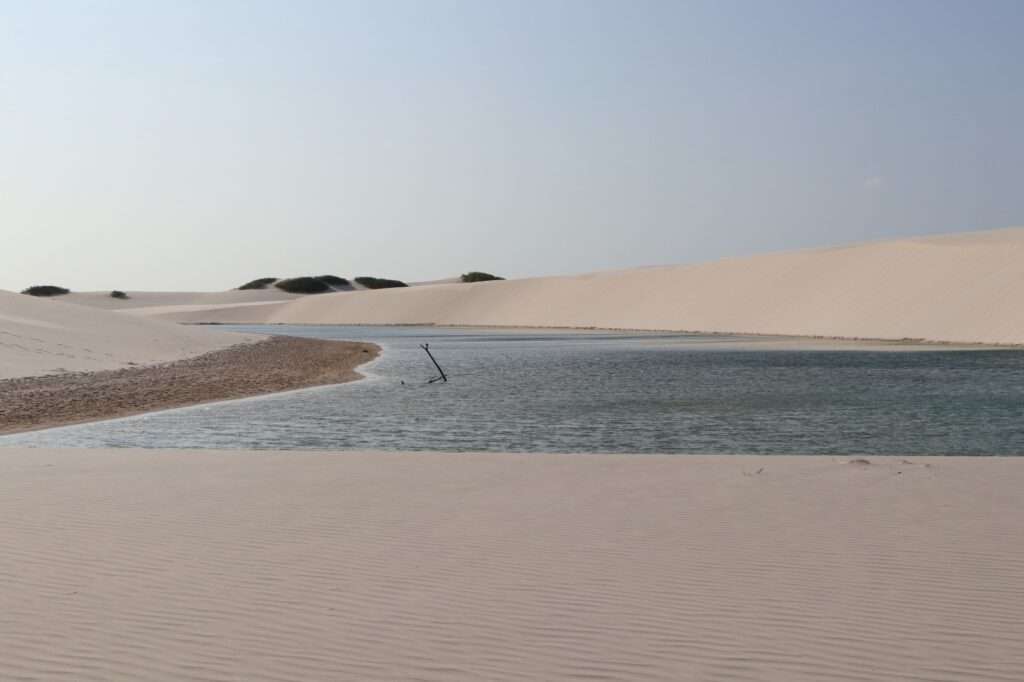 Pour y parvenir, nous quittons Barreirinhas et les derniers villages et nous engageons sur des pistes dont la praticabilité dépend étroitement de la saison. Le Hilux glisse, s’enfonce, repart ; parfois d’autres véhicules attendent près d’un bras d’eau, silhouettes patientes sur le sable. À mesure que l’on avance, le relief devient ondulant, mobile, presque abstrait : dunes blanches qui se succèdent comme des vagues pétrifiées, bancs de sable ourlés d’une eau calme et claire. Parfois un morceau de bois flotté, noirci et sculpté par le temps, émerge au bord de la lagune, contraste saisissant entre la matière organique et la pureté minérale du site.