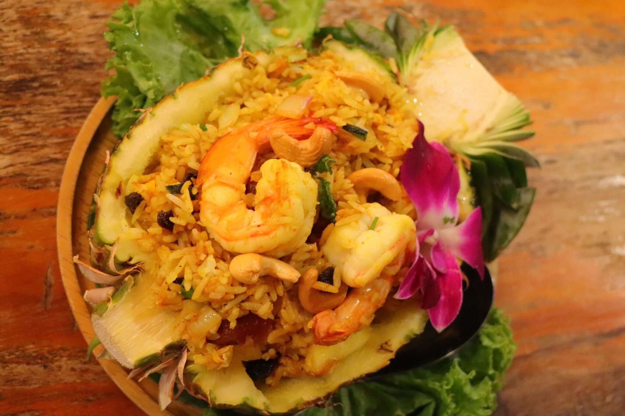 Bastien, enfin, s’est laissé tenter par un pineapple fried rice with battered prawns, servi dans une coque d’ananas. Un plat lumineux, joyeux, où le sucré du fruit rencontre le salé du riz sauté et le croustillant des crevettes frites. Une assiette qui respire la Thaïlande du Nord, entre fantaisie et tradition.