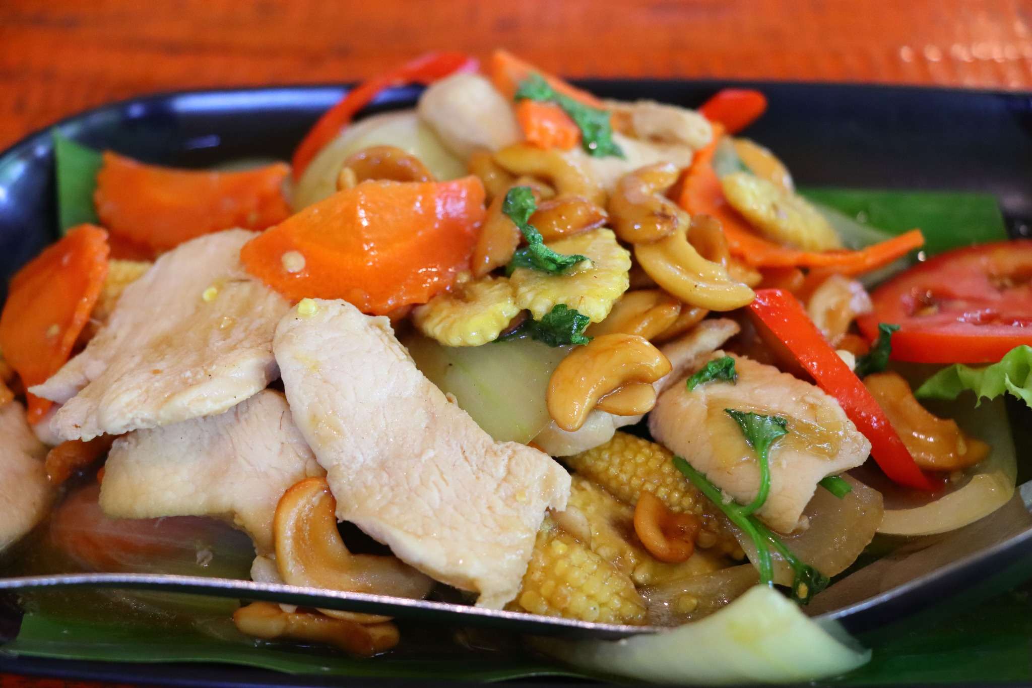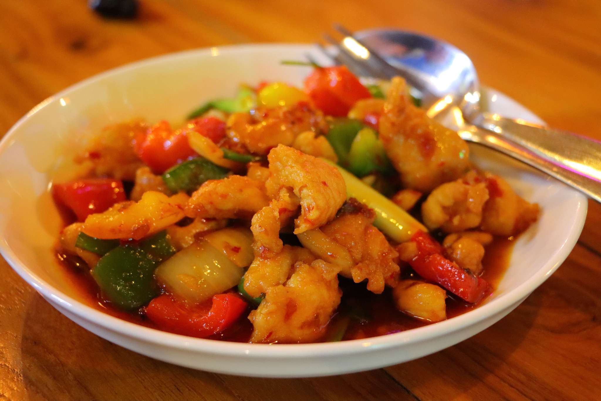 La carte du Malakor est variée, généreuse, et raconte à sa manière l’histoire culinaire de la région. Nadège et Margot choisissent un Plakapong Pad Preaw Waan, ici proposé soit avec du poisson Sea Bass, soit avec du poulet. Elles optent pour la version poulet, un choix qui met en valeur la texture tendre et juteuse de la viande, parfaitement enrobée d’une sauce aigre‑douce typiquement thaïlandaise. Cette sauce, héritière des influences chinoises, mêle le sucre de palme, le vinaigre, la tomate et parfois un soupçon d’ananas, créant un équilibre subtil entre douceur, acidité et une pointe de salinité. Le résultat est un plat lumineux, coloré, où chaque bouchée oscille entre croustillant et fondant.