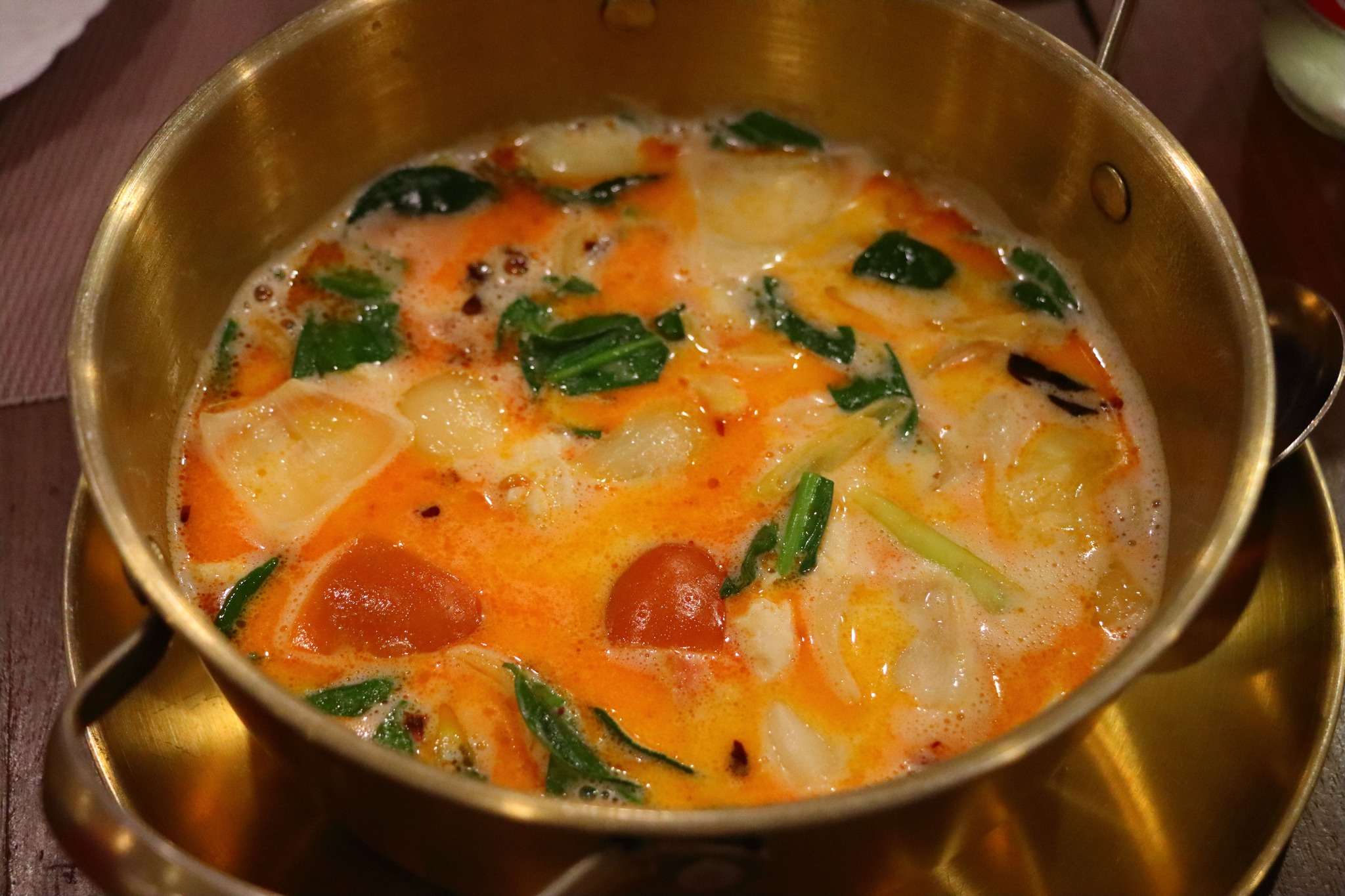 J’opte pour la spécialité de la maison, le Tom Yam Mekong Fish. Ici, le poisson vient directement du fleuve : une chair tendre, légèrement douce, qui absorbe à merveille le bouillon citronné. Le Tom Yam, né dans les campagnes thaïlandaises, est un équilibre fascinant entre acidité, chaleur et fraîcheur. La citronnelle ouvre le nez, le galanga apporte cette note presque camphrée, les tomates adoucissent, et le piment réveille tout le monde. C’est un plat réputé pour « nettoyer » le corps : il dégage, réchauffe, stimule la digestion, et laisse une sensation de légèreté malgré son intensité.