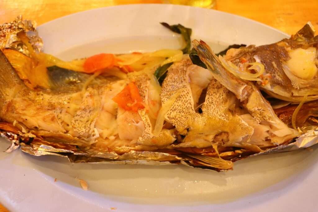Le parfum qui se dégage — fumé, citronné, épicé juste ce qu’il faut — emplit l’air et titille nos papilles. Au bout de dix minutes, la peau se détache en fines lambeaux croustillants et la chair, moelleuse et juteuse, se sépare en flocons nacrés. Nous prélevons chaque bouchée à la fourchette et à la cuillère, accompagnant le poisson de riz gluant et d’une salade de papaye verte relevée d’échalotes, de cacahuètes et de quelques quartiers de lime.