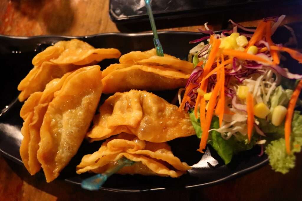Ce soir-là, nous décidons de nous laisser porter par l’humeur du marché. On commence par des kimbap, ces rouleaux de riz coréens vendus à 39 bahts, préparés avec une précision presque chorégraphique. Puis viennent les steamed dumplings, fourrés au porc ou au haricot rouge, à 10 bahts l’unité. Leur pâte lisse et brillante, leurs couleurs douces, leur vapeur qui s’échappe à chaque ouverture du panier en bambou… tout donne envie de tendre la main.