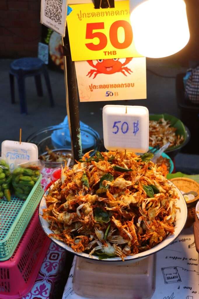 Ce marché est relativement récent à l’échelle de la ville, mais il s’inscrit dans une tradition thaïlandaise bien plus ancienne : celle des walking streets, ces rues piétonnes temporaires où l’on vient autant pour manger que pour flâner, écouter, observer, se laisser porter. En Thaïlande, le marché n’est pas un lieu de consommation : c’est un espace social, un prolongement de la maison, un endroit où l’on prend le temps. On y vient pour discuter, pour goûter, pour regarder les artistes de rue, pour laisser les enfants courir entre les stands, pour sentir que la ville respire ensemble.