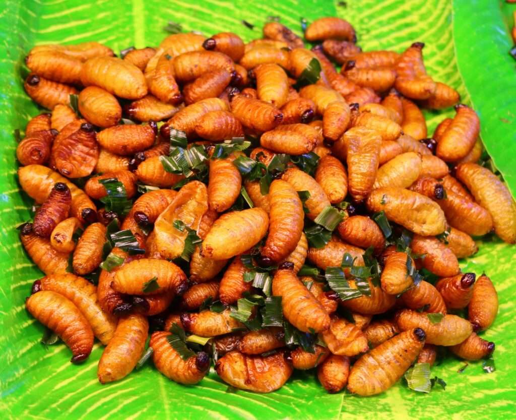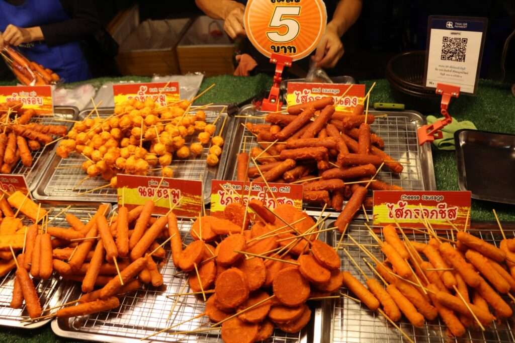 Un peu plus loin, des sushis à 10 bahts s’alignent comme de petites œuvres d’art, soigneusement décorés. À côté, un stand prépare des crêpes pour enfants, décorées avec une minutie incroyable : couleurs vives, formes amusantes, presque trop jolies pour être mangées. Bastien, fidèle à son style, craque pour un nouveau pad thaï, sauté à la minute, fumant, brillant. Moi, je me laisse tenter par des brochettes de bœuf à 10 bahts pièce, grillées juste ce qu’il faut, avec cette pointe de marinade sucrée-salée typique du nord. Nadège, elle, picore des saucisses thaïes, légèrement fermentées, puis finit par s’offrir une part de pizza, preuve que le marché accueille toutes les envies, toutes les influences.