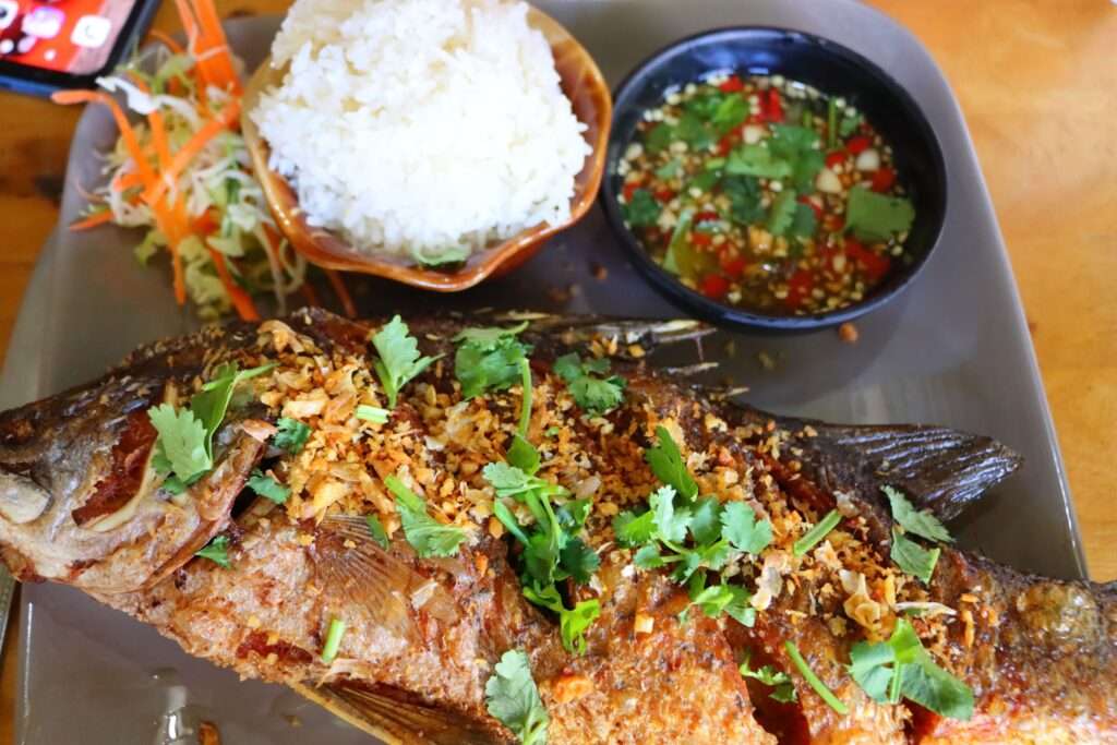 Dans le Nord-Est, l’Isan, l’influence lao est évidente. Ici, nous découvrons une cuisine plus rustique, très épicée, parfois fermentée, où le som tam côtoie les grillades et les sauces puissantes. Le riz gluant se mange avec les doigts, et chaque repas devient un moment convivial, presque brut dans son intensité.