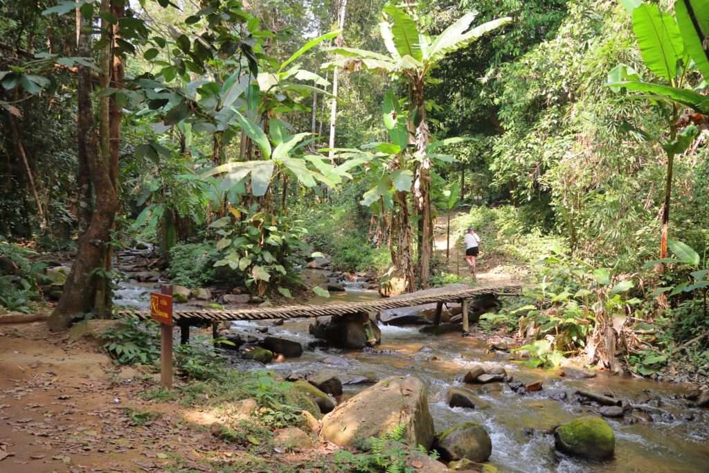 Le sentier serpente le long d’un ruisseau clair qui cascade sur des rochers moussus. Par endroits, un petit pont de bambou permet de traverser l’eau, grinçant légèrement sous le pas. Plus loin, un escalier improvisé en rondins aide à franchir une pente raide. Tout autour, la forêt se densifie : fougères géantes, lianes qui pendent comme des cordes, troncs immenses qui montent droit vers la canopée. La lumière filtre en taches dorées, et les papillons multicolores semblent flotter dans l’air chaud.