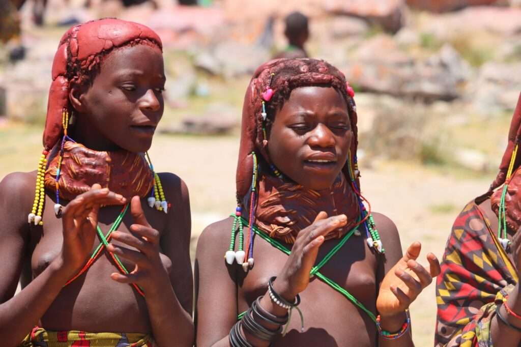 Les femmes Mumuilas, sous-groupe emblématique, attirent naturellement le regard. Leurs coiffures d’argile rouge, épaisses et sculpturales, semblent prolonger la terre elle-même. Elles portent sur la tête la couleur du territoire, dans un style codé qui raconte l’âge, le mariage ou la maternité. Autour du cou, les colliers empilés forment comme une armure de beauté et de mémoire. Rien n’est laissé au hasard : la parure devient ici langage, statut, et parfois prière silencieuse.