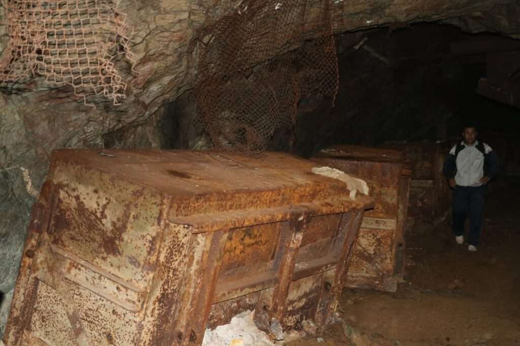 Deux habitants locaux se proposent alors comme guides improvisés pour nous faire découvrir les secrets de la mine. Nous pénétrons à l’intérieur et longeons un vaste couloir de 2 kilomètres, où autrefois circulaient les wagonnets chargés de minerai. À l’extrémité du tunnel, éclairés par la lumière de nos téléphones portables, nous découvrons l’ancienne cage qui servait à descendre dans les galeries.
