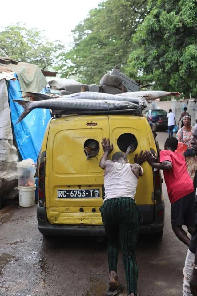 Nous traversons le port, un endroit insolite, coloré, bruyant : les caisses de poissons sont transportées sur la tête, des barracudas sont posés sur les toits de voiture et parfois même à l’intérieur, leur tête passant par la fenêtre. L’activité est intense.