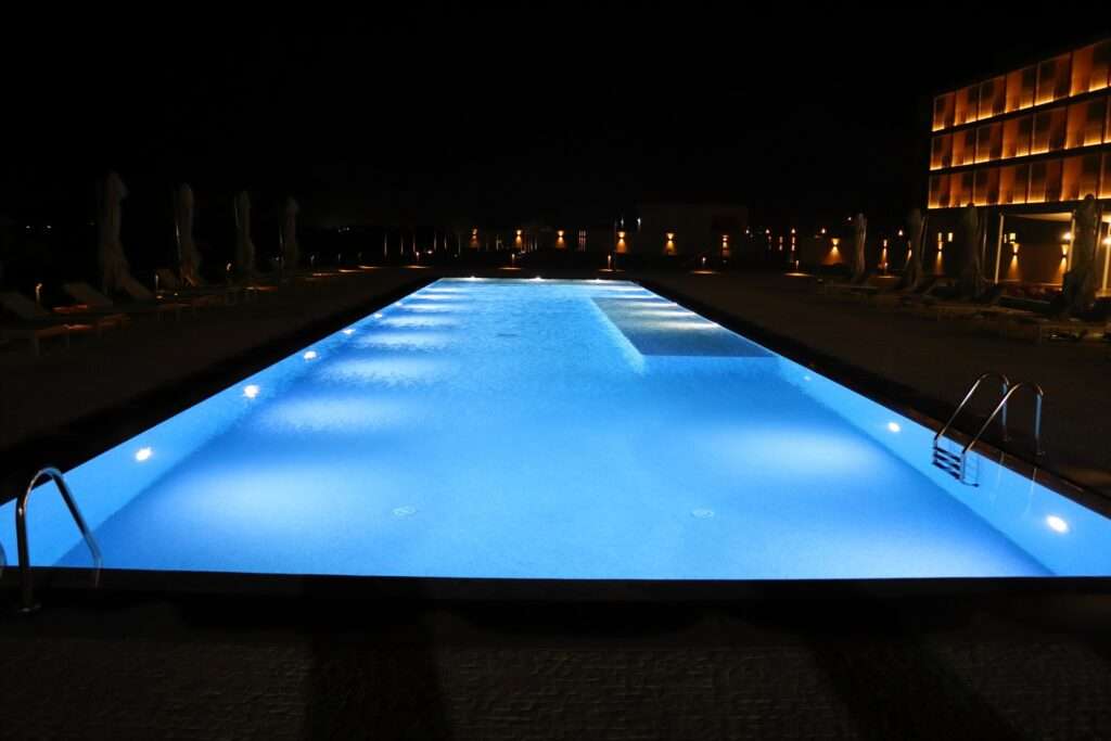 La terrasse du restaurant nous attire aussitôt : une piscine magnifiquement éclairée s’étend au centre du patio, miroitant sous les lampes, tandis que la brise de l’Atlantique effleure les tables. L’air embaume d’épices et de grillades. Le service, attentionné sans être pressant, ajoute à la sérénité du lieu.