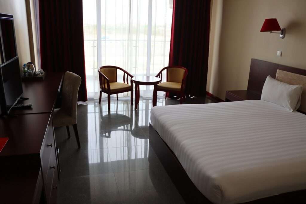 À la réception, l’accueil angolais se fait sentir dès le premier sourire. Les formalités sont rapides, et l’on nous confie bientôt les clés de notre chambre. À l’étage, l’espace nous enveloppe dans une atmosphère paisible : un grand lit moelleux nous invite à la détente, les draps impeccables respirent le coton frais, et la climatisation murmure à peine. Une petite terrasse s’ouvre sur le parking ombragé — parfait pour faire sécher nos vêtements de voyage et reprendre notre souffle.