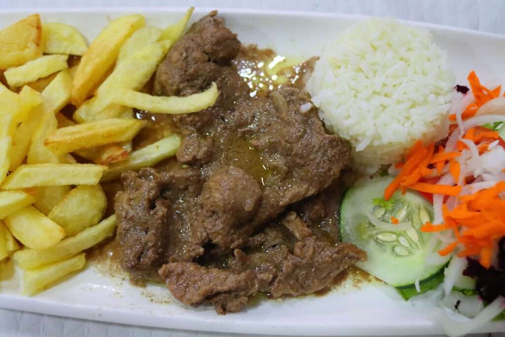Quant à moi, je choisis le plat du jour : Bife à la Panela. Il s’agit d’un ragoût de bœuf mijoté longuement en cocotte, dans une sauce brune parfumée aux oignons, ail, poivre noir et parfois un soupçon de vin rouge. La viande est fondante, imprégnée de saveurs profondes, servie avec riz blanc, frites maison, et une salade fraîche. Ce plat, typique des cuisines de terroir, évoque les repas familiaux du dimanche, où le temps de cuisson devient un ingrédient à part entière.