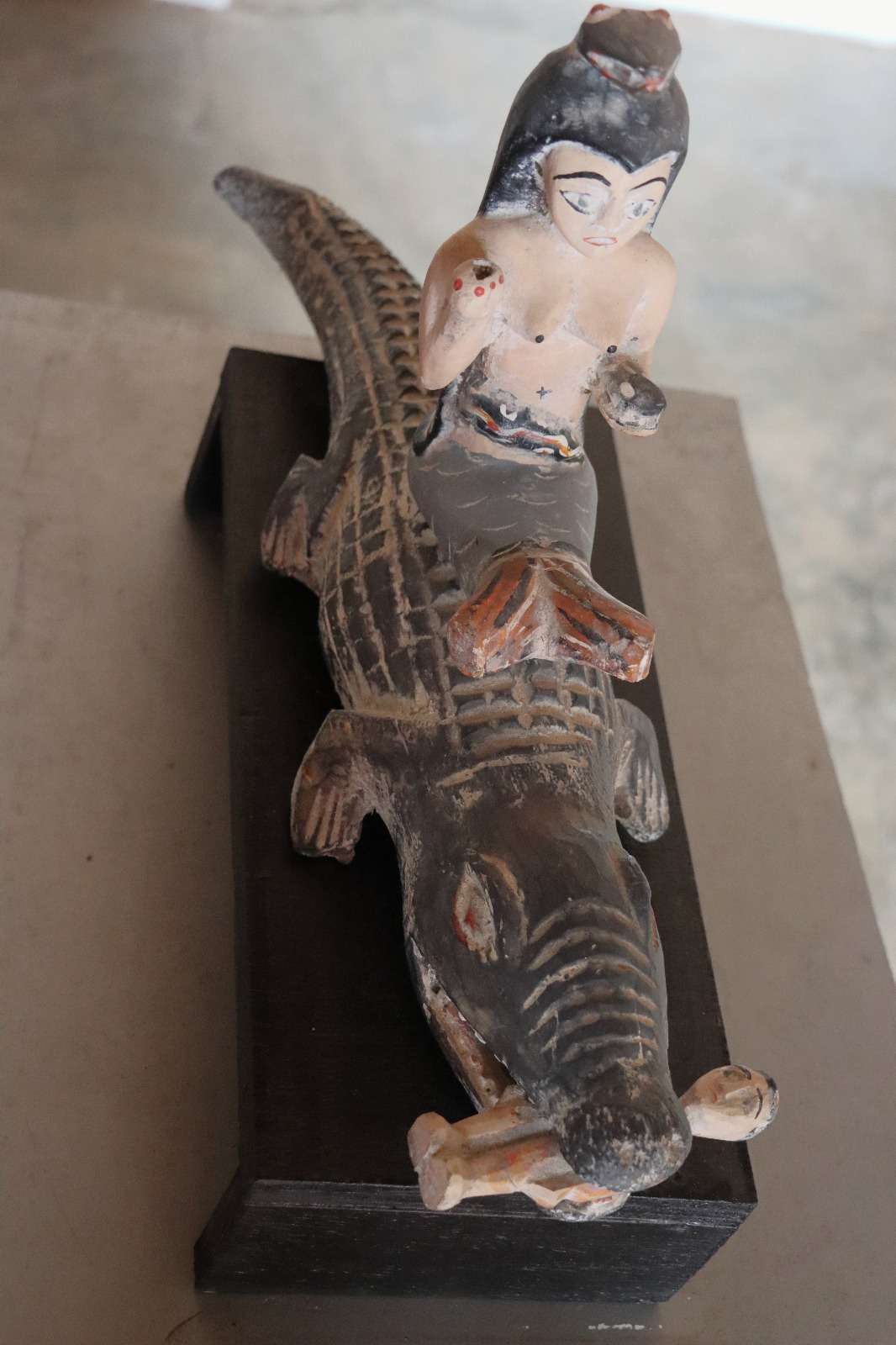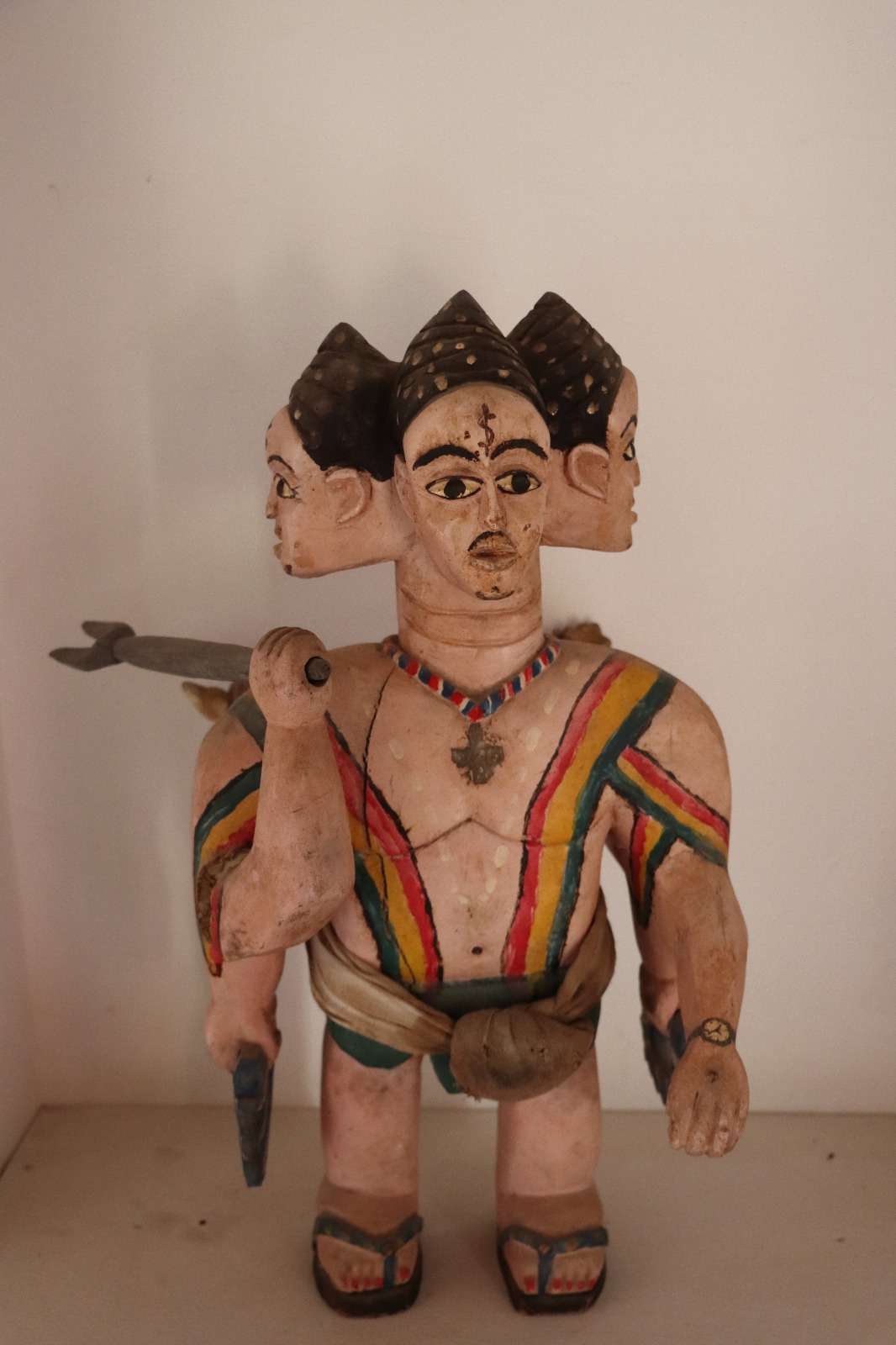 Mami Wata incarne la dualité absolue. Déesse de la beauté, de la séduction et de la prospérité, elle promet fortune et pouvoir à ceux qui l’honorent. Mais elle est aussi redoutable : ses eaux engloutissent les imprudents, ses caprices ruinent les familles. Au cœur du musée, son autel scintillant de pièces d’or factices et de bouteilles de champagne vide rappelle ce pacte ambigu. « Elle exige tout : votre âme, votre apparence, votre liberté. En échange, elle donne tout… ou rien », explique une plaque. Nous avons observé, fascinés, une statue la représentant avec une queue de poquet couverte d’écailles dorées, tenant un peigne et un serpent — symboles de vanité et de danger.