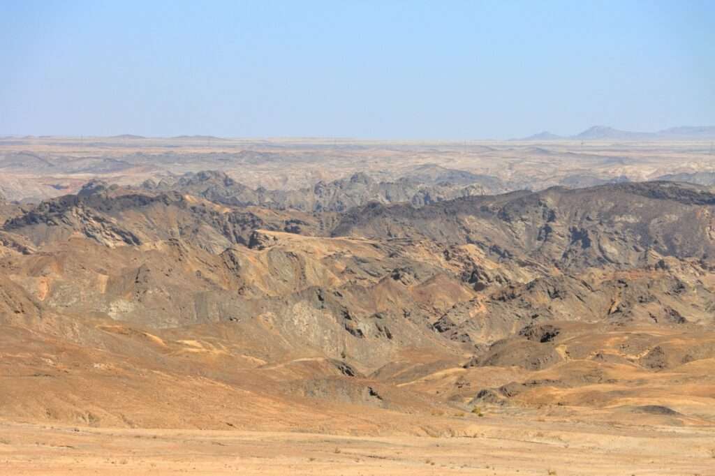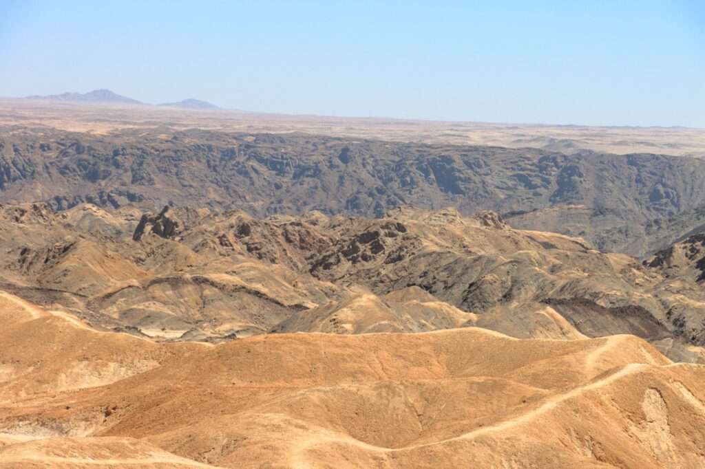 Nous descendons ensuite vers le lit asséché de la rivière, où quelques campements se nichent entre les buissons. Le silence qui y règne est profond, un silence que seul le craquement du gravier sous nos pas vient troubler. L’érosion a sculpté des promontoires et des canyons miniatures qui offrent des points de vue vertigineux sur la vastitude du désert namibien. À chaque pas, nous apprenons que marcher ici, c’est lire un paysage comme on lit un palimpseste : les anciennes écritures n’ont jamais entièrement disparu.