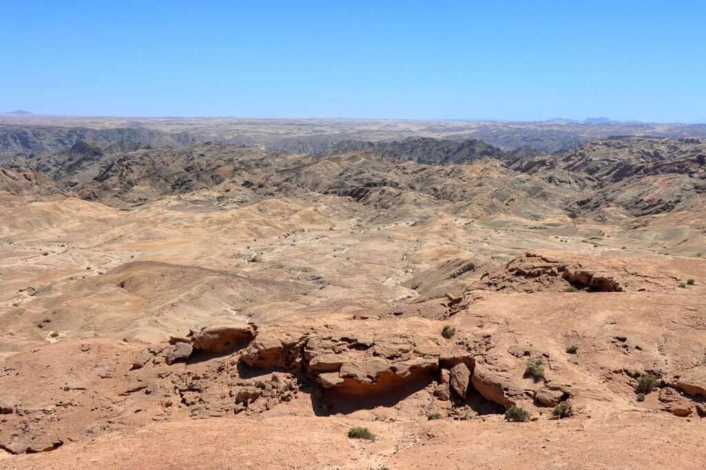 Depuis un promontoire dominant la vallée de la Swakop, le paysage s’étend et s’ordonne. Les sillons d’érosion dessinent de longues arabesques dans les dépôts meubles ; les strates de grès affleurent comme les pages d’un livre de pierre feuilleté par les âges. Dans cette aridité extrême, quelques arbustes persistent. Le Dollar Bush, avec ses feuilles rondes et charnues, emmagasine l’eau comme une monnaie rare. L’Ink Bush, plus élancé, laisse filtrer la lumière entre ses feuilles fines. Tous deux survivent avec moins de 20 mm de pluie par an, souvent concentrés en une seule averse. Leur présence, discrète mais tenace, raconte une écologie résiliente, intimement liée aux cycles géologiques.