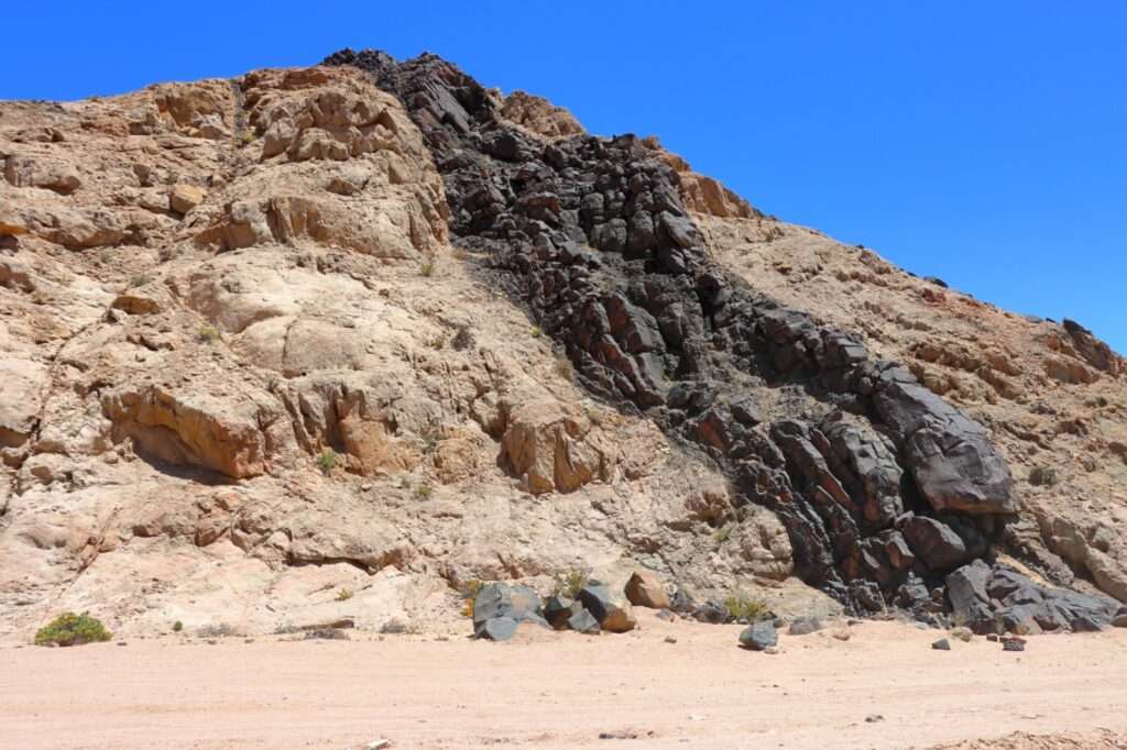 Quand nous rebroussons chemin pour retrouver la piste principale, une crête noire attire notre regard. Elle serpente à travers les collines comme une cicatrice minérale parfaitement dessinée. C’est une intrusion de dolérite, roche magmatique très dure, injectée autrefois dans des fissures de matériaux sédimentaires plus tendres. Avec le temps, l’érosion a éliminé ces derniers, laissant subsister ce ruban sombre, véritable ligne dorsale du paysage. Nous traversons même une dyke de dolérite, une paroi presque architecturale où la lave refroidie est restée prisonnière de la roche granitique. Ces intrusions témoignent d’un passé volcanique où l’Afrique australe se fragmentait et se recomposait.