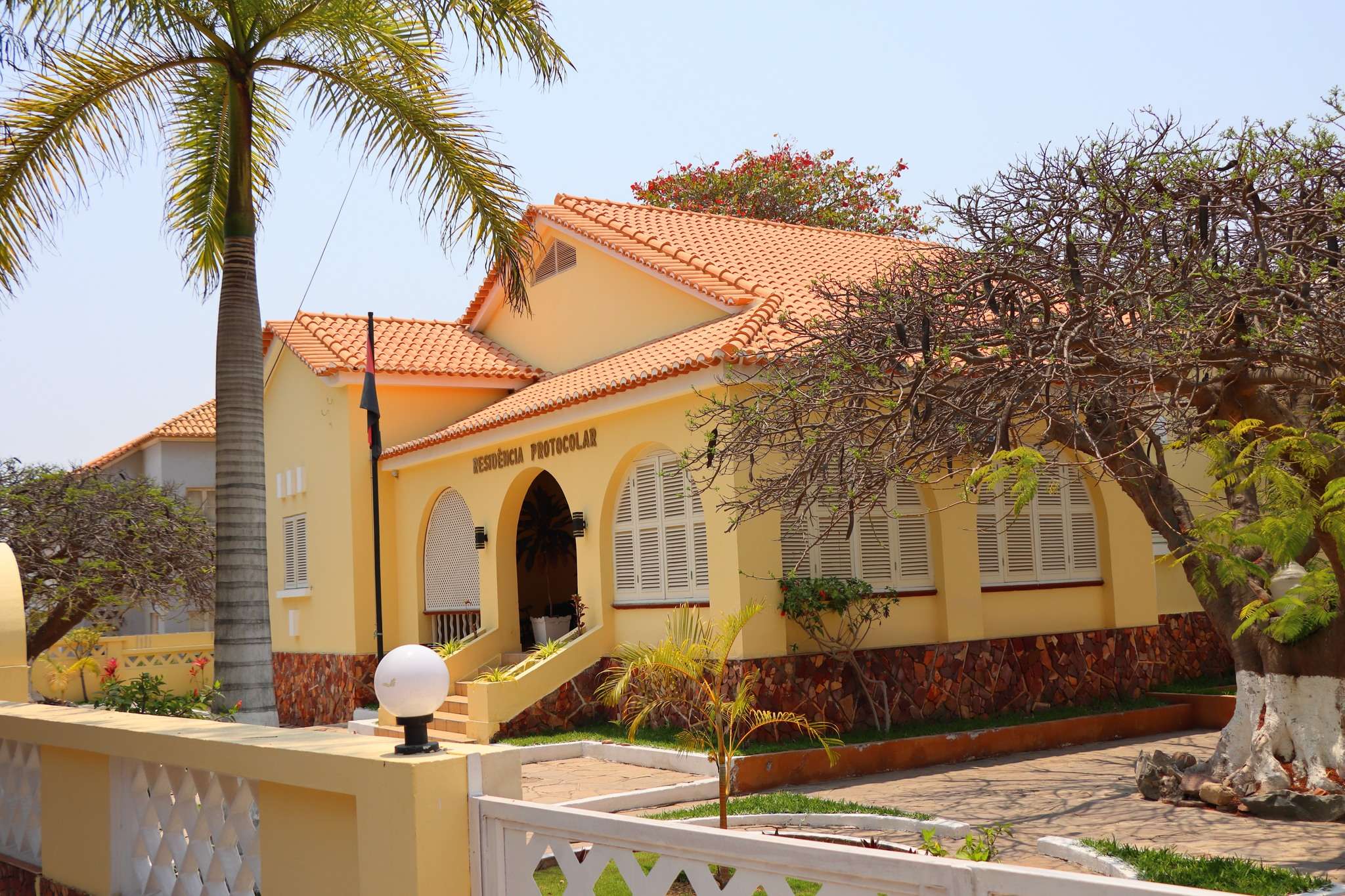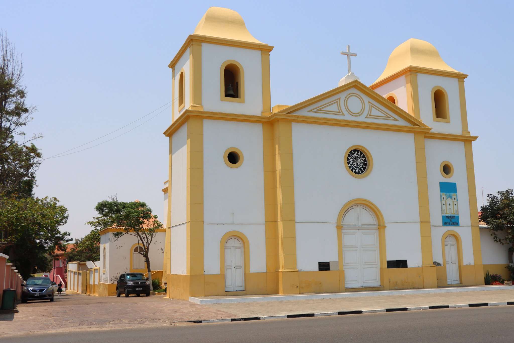 Nous reprenons la route vers le centre de Moçâmedes. L’urbanisme est régulier, les façades pastel se succèdent, empreintes d’un charme suranné. Devant nous se dresse un palais rose à moulures blanches et balcon central — sans doute un bâtiment administratif. Un peu plus loin, une église blanche coiffée de dômes jaunes domine la place, sa rosace bleue scintillant dans la lumière. La Biblioteca Pública, aux murs jaunes et au toit de tuiles rouges, respire la quiétude, entourée de palmiers et de clôtures blanches décorées.