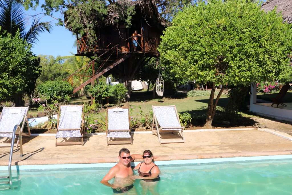 Les 21 bungalows de l’hôtel s’éparpillent entre jardin tropical et plage bordée de filaos. Certains d’entre nous dorment presque les pieds dans l’eau, bercés par le clapotis des vagues ; d’autres profitent du calme du parc luxuriant, où le chant des grenouilles et des geckos remplace peu à peu le tumulte de la route. Si le confort est modeste, l’essentiel est là : un lit propre, une douche fraîche, et surtout, une immersion totale dans la nature.