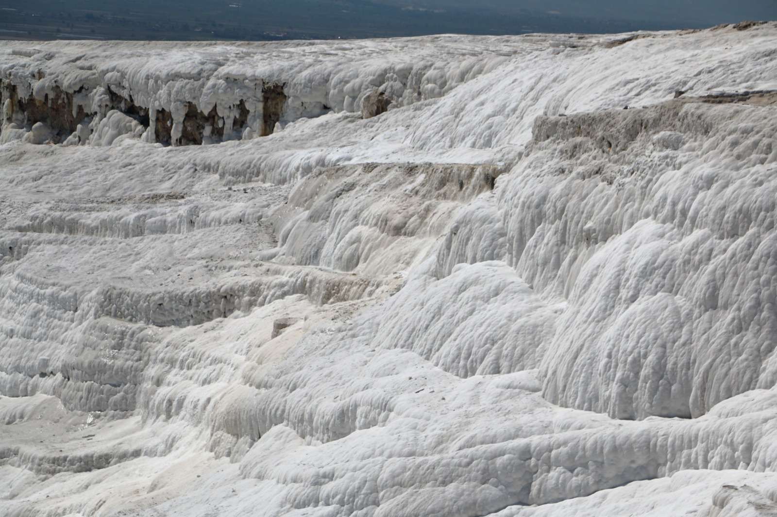 Nous découvrons ici un processus géologique fascinant et minutieux. L’eau des sources thermales, naturellement chaude et riche en minéraux, notamment en carbonate de calcium, s’écoule lentement sur les pentes. Au fur et à mesure de son parcours, cette eau, initialement saturée de minéraux, subit une décompression qui entraîne la perte de dioxyde de carbone. Ce changement, combiné à l’évaporation induite par la chaleur du soleil, modifie l’équilibre chimique de la solution. Ne pouvant plus retenir le carbonate de calcium en solution, celui-ci se précipite sous forme de dépôts calcaires. Ce phénomène, que les scientifiques désignent comme une précipitation, se répète inlassablement, ajoutant chaque nouvelle couche de travertin à un rythme d’environ deux centimètres par siècle.