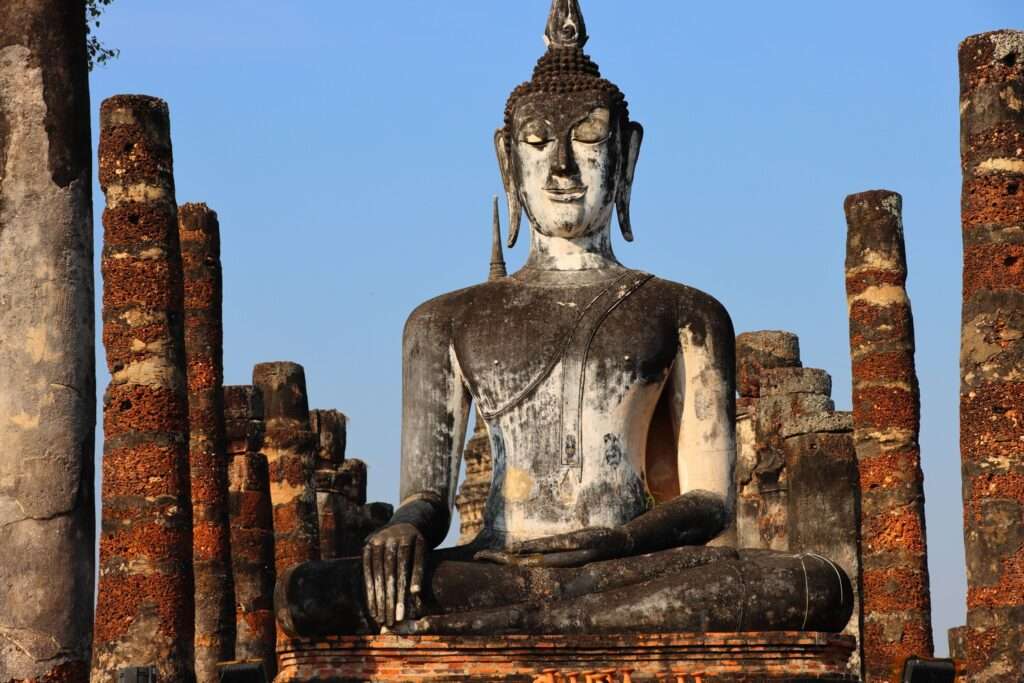 En nous arrêtant devant le grand Bouddha assis, entouré de colonnes érodées, nous ressentons une paix dense, presque palpable. Le silence du lieu, la lumière sur la pierre, les ombres des stupas, tout semble orchestré pour nous rappeler que nous sommes ici au cœur du royaume et de la foi, là où Sukhothaï s’est rêvée juste, éclairée et universelle.