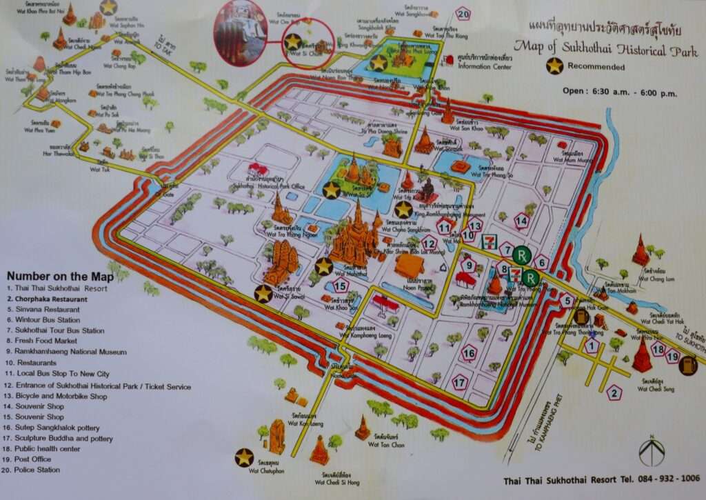 À l’aube, lorsque nous quittons notre hôtel pour rejoindre le Parc historique de Sukhothaï, la lumière est encore douce, presque dorée, et la fraîcheur matinale donne au paysage une clarté nouvelle. À seulement deux kilomètres s’étend ce qui fut le cœur du premier royaume thaïlandais, un espace où l’histoire, la foi et l’urbanisme se mêlent encore avec une harmonie saisissante. Le site ouvre dès 6h30, comme pour rappeler que Sukhothaï signifie « l’aube du bonheur », et cette promesse semble flotter dans l’air lorsque nous franchissons l’entrée centrale, billet en main, prêts à explorer les différentes zones du parc.