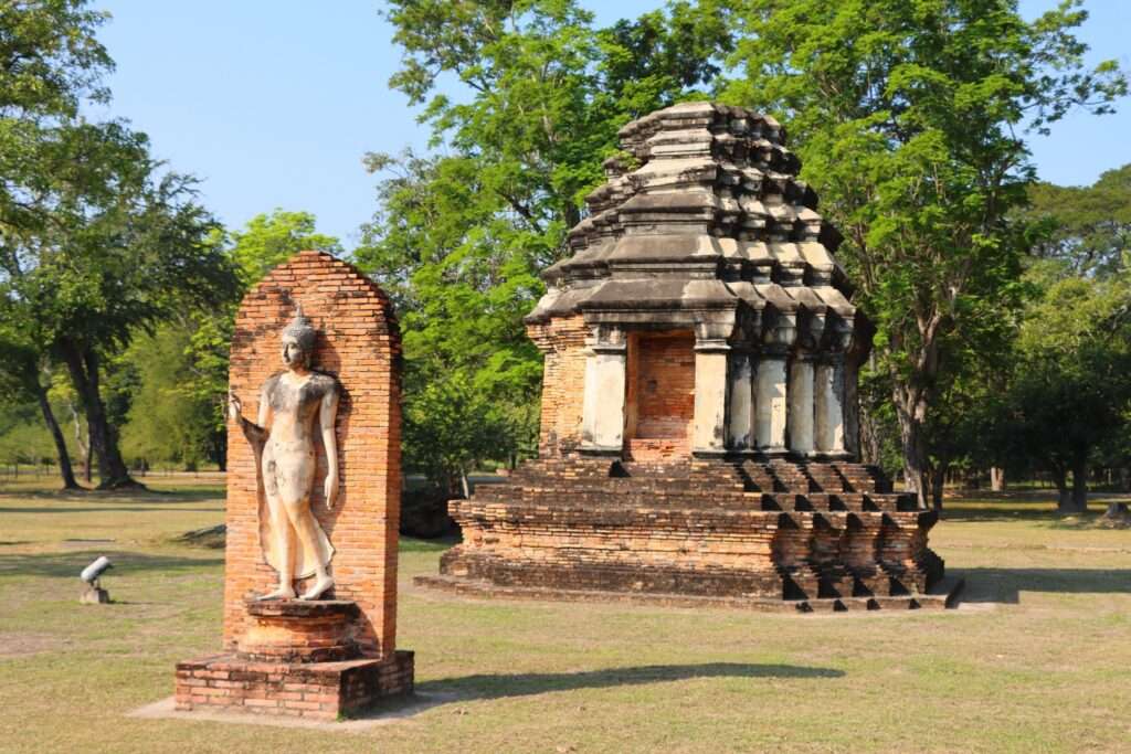 Plus à l’ouest, la forêt reprend ses droits. La zone ouest est un monde de collines, de latérite et de silence. Les temples y sont plus dispersés, souvent perchés sur des hauteurs, comme des ermitages tournés vers l’horizon. C’est ici que l’on perçoit le mieux la dimension cosmique de Sukhothaï : les stupas semblent dialoguer avec le ciel, les arbres enveloppent les sanctuaires, et les chemins de terre rappellent les routes empruntées par les moines forestiers. Cette zone, plus sauvage, évoque la quête intérieure, la retraite, la méditation profonde.