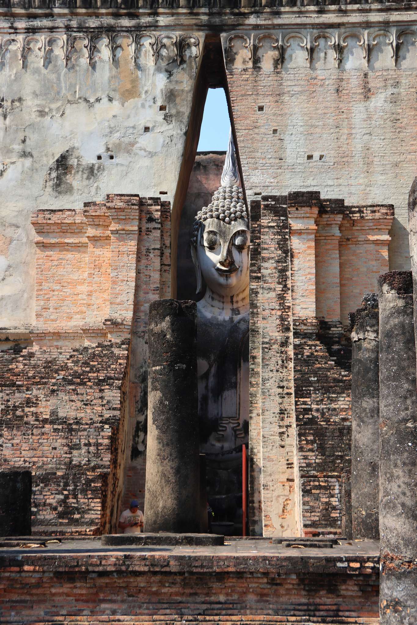 En quittant ce noyau urbain, nous glissons vers la zone nord, où l’atmosphère change subtilement. Ici, les temples semblent plus isolés, plus méditatifs, comme s’ils avaient été conçus pour accueillir les moines en quête de solitude. Le Wat Si Chum, avec son immense Bouddha assis abrité dans un mandapa ouvert, domine cette partie du parc. Son regard, à la fois doux et pénétrant, semble traverser les siècles. La zone nord est un espace de contemplation, un prolongement spirituel du centre, où l’on ressent encore la présence des maîtres de méditation et des communautés monastiques qui vivaient à l’écart de l’agitation de la capitale.