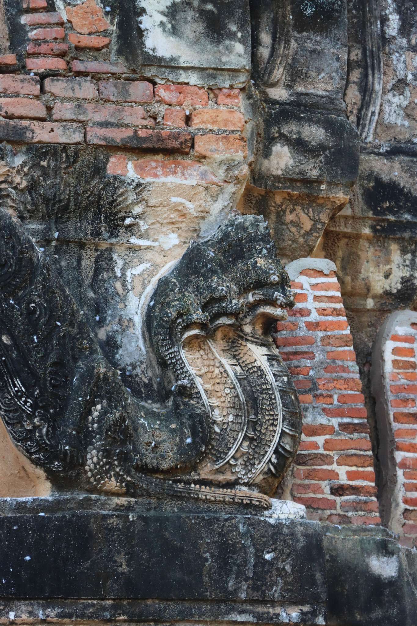 La base du chedi principal est ornée de stucs en relief représentant des disciples bouddhistes marchant les mains jointes en signe de salutation. Ces figures, alignées comme une procession éternelle, incarnent la continuité de la foi et la transmission des enseignements. Elles ne décorent pas : elles racontent. Elles ne ornent pas : elles prient.