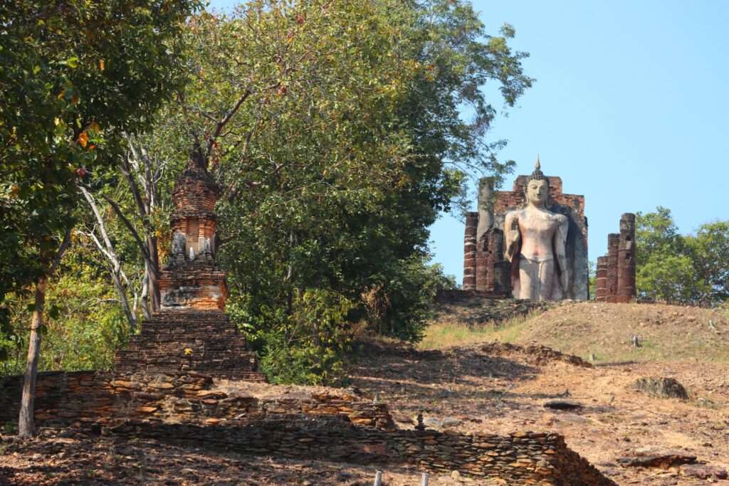 Plus à l’ouest, Wat Saphan Hin se mérite après une montée d’environ 200 m. Du sommet, un grand Bouddha debout domine le parc et offre une vue panoramique sur les ruines dispersées au milieu d’une jungle renaissante, rappelant la dimension stratégique et symbolique de ces sites.