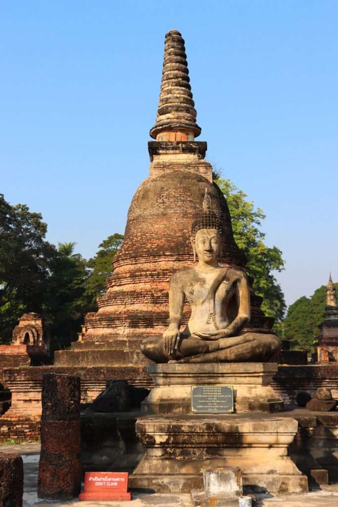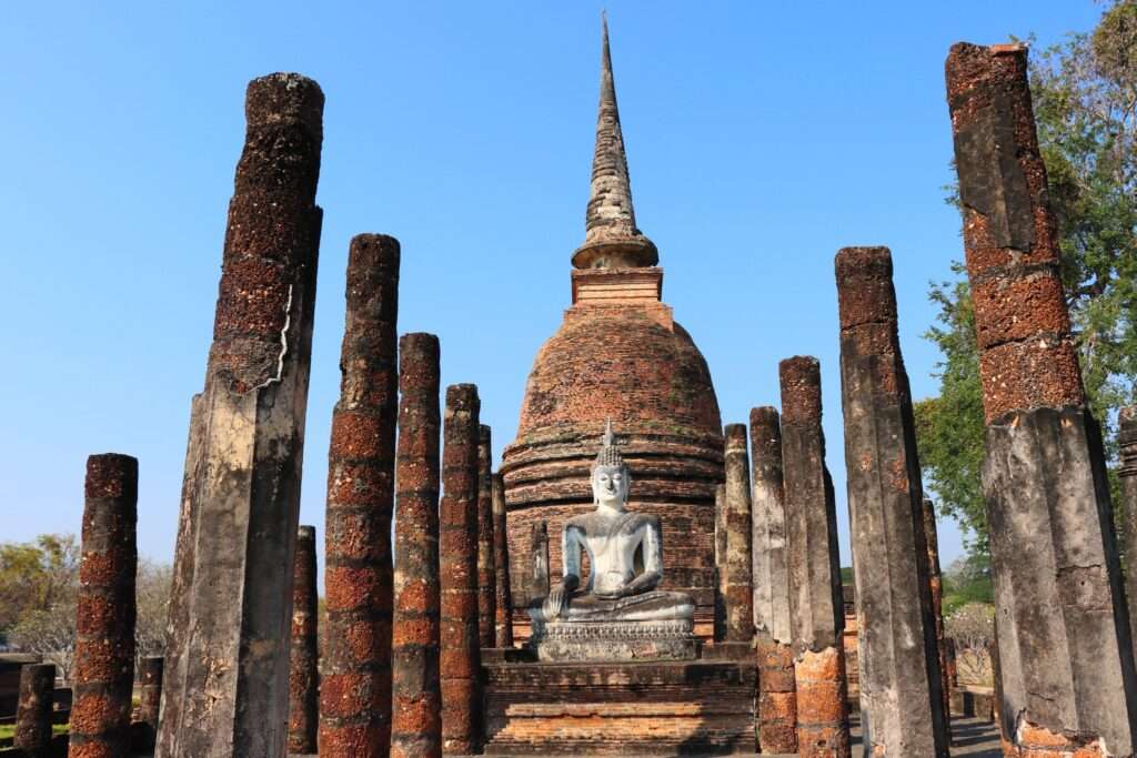 En nous arrêtant devant le grand Bouddha assis, entouré de colonnes érodées, nous ressentons une paix dense, presque palpable. Le silence du lieu, la lumière sur la pierre, les ombres des stupas, tout semble orchestré pour nous rappeler que nous sommes ici au cœur du royaume et de la foi, là où Sukhothaï s’est rêvée juste, éclairée et universelle.