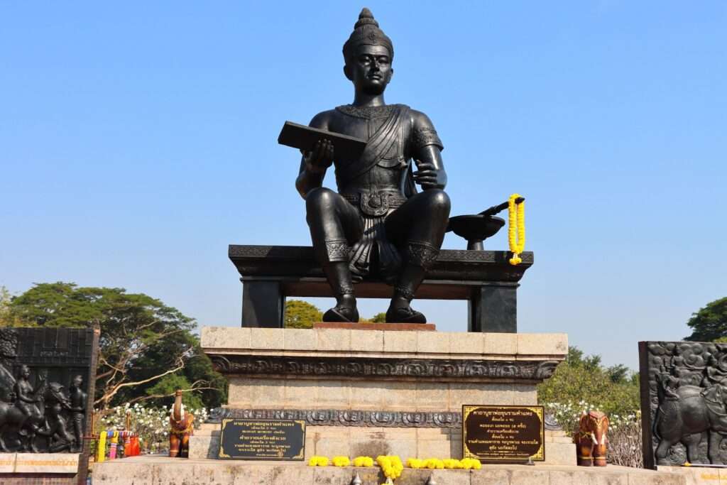 Assis sur un trône de bronze, le souverain regarde l’horizon, une main posée sur un manuscrit, l’autre ouverte comme pour transmettre. Autour de lui, des bas-reliefs racontent sa vie, ses réformes, ses voyages, sa vision d’un royaume juste et éclairé. Les plaques explicatives évoquent la création de l’alphabet thaï en 1283, la diffusion du bouddhisme Theravāda, et l’émergence d’une culture siamoise fondée sur la compassion, la justice et l’équilibre.