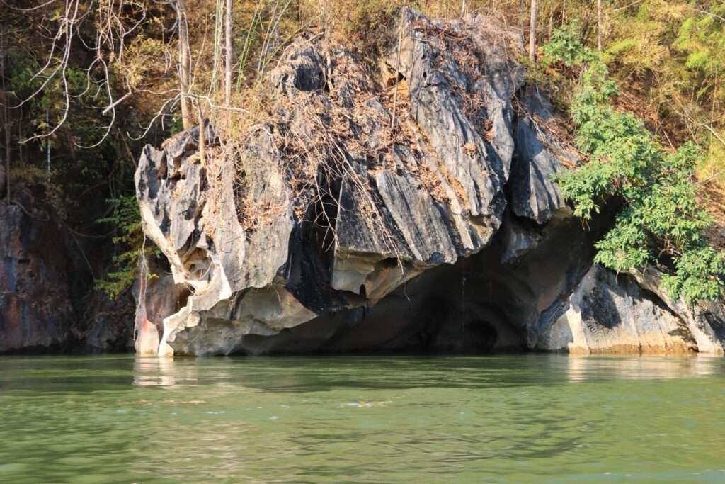 Nous commençons par une balade en long-tail boat (400 B), glissant sur les eaux calmes de la rivière Kwai. Le paysage est somptueux : falaises calcaires creusées de cavités, végétation dense qui descend jusqu’à l’eau, maisons flottantes bordées de hamacs, radeaux de bambou amarrés à des pontons de bois. Certaines barges sont des restaurants, d’autres des hébergements, toutes semblent suspendues dans une tranquillité liquide. Les parois rocheuses, sculptées par l’érosion et les infiltrations d’eau, révèlent des strates de calcaire et de grès, parfois teintées de rouge ou de vert selon les dépôts minéraux. Ce relief karstique, typique de la région, abrite grottes, cavités et sources chaudes dissimulées en aval.