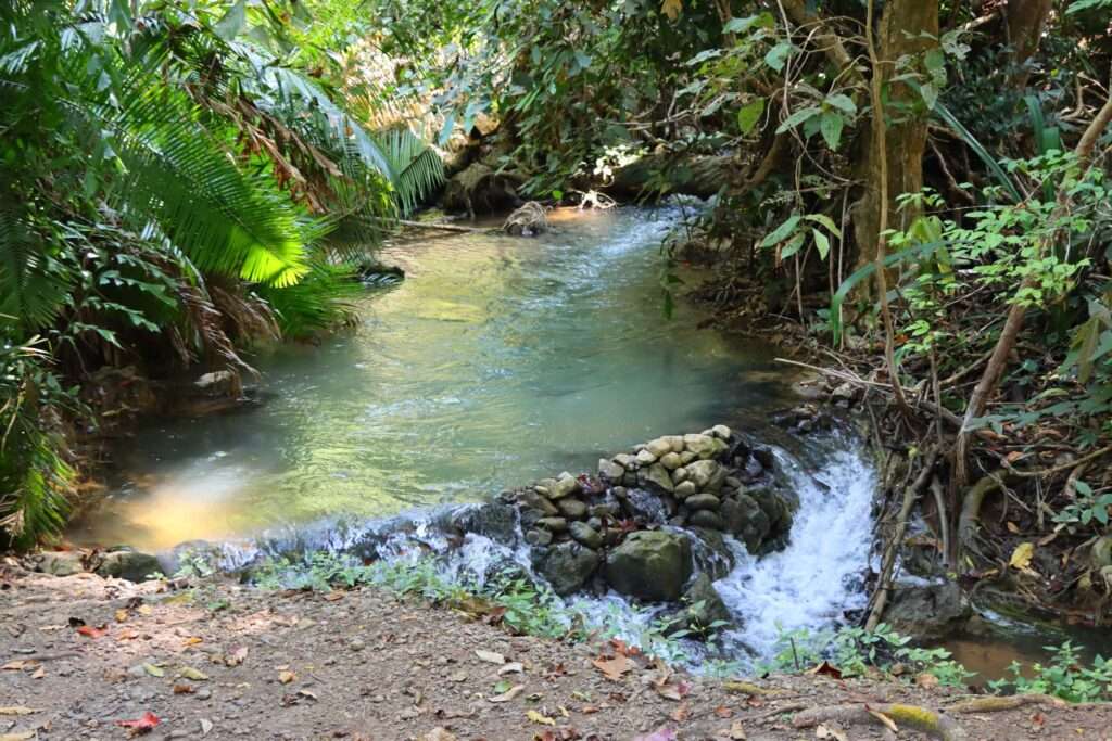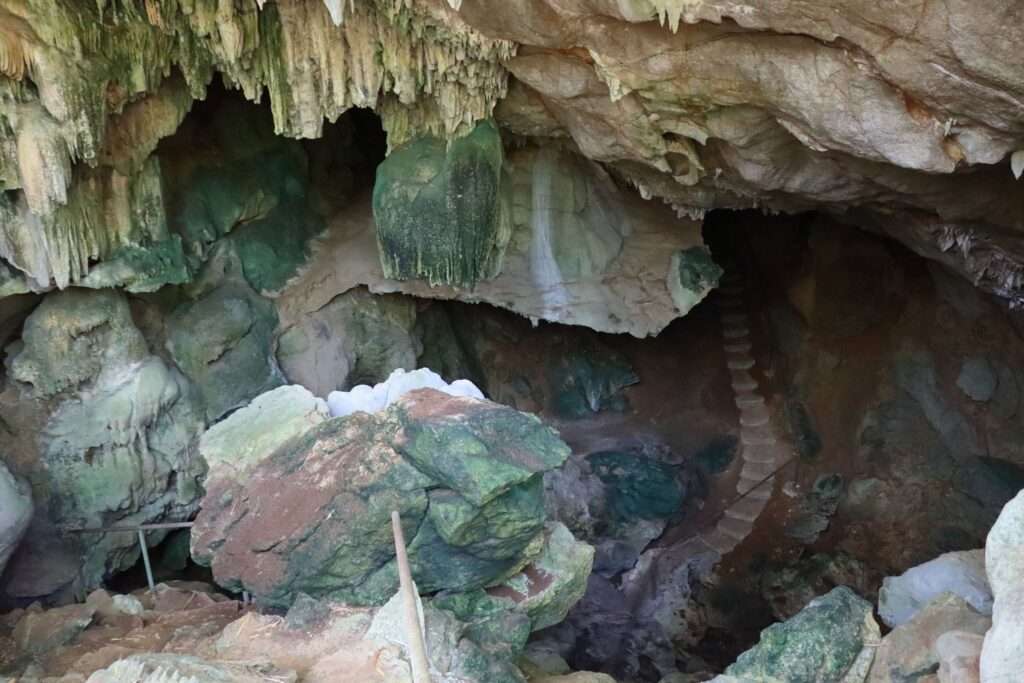 Le sol est tapissé de feuilles sèches, et à chaque pas, le craquement discret accompagne les bruissements du vent. Des cris de singes résonnent au loin, parfois suivis de mouvements furtifs dans les feuillages. L’ambiance est à la fois paisible et vibrante, comme si la forêt elle-même respirait autour de nous. En chemin, nous croisons les vestiges de la ligne de chemin de fer et une source naturelle. L’entrée de la grotte, creusée dans la falaise, révèle des formations minérales spectaculaires : stalactites, colonnes, draperies de calcite sculptées par le temps et l’eau.