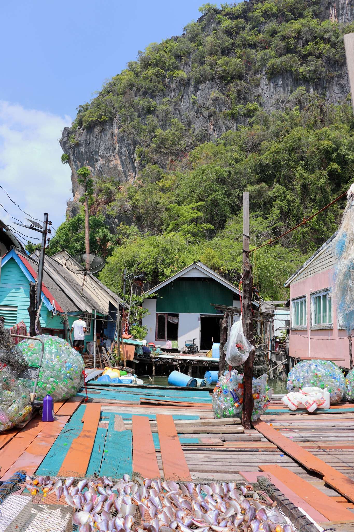 Aujourd’hui, le décor est toujours spectaculaire, mais le quotidien s’est métamorphosé. Le sur‑tourisme a transformé Koh Panyi en un immense bazar flottant : restaurants, boutiques de souvenirs, étals de perles et de coquillages, stands de vêtements et gadgets. L’authenticité se cache derrière les échoppes, et il faut parfois un œil attentif pour saisir une image originelle : un enfant qui court sur une passerelle, un pêcheur qui répare son filet, une vieille femme qui prépare du poisson séché. Ces instants existent encore, mais ils sont noyés dans le flot des visiteurs.