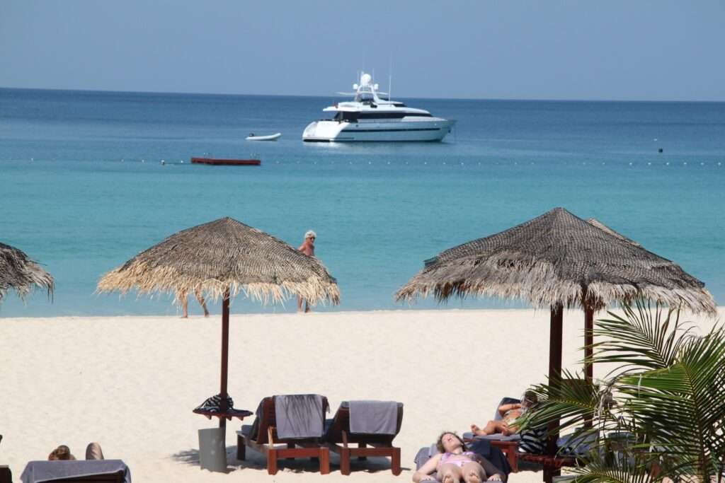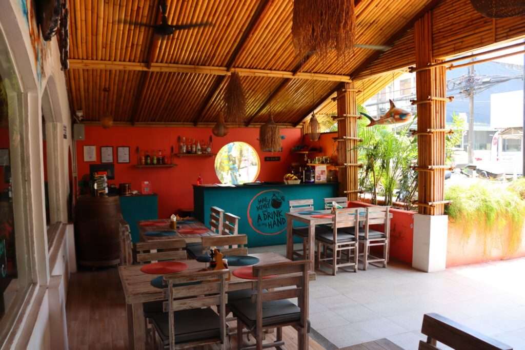 Après cette immersion aquatique, direction The Cove, un restaurant et beach bar installé directement au bord de l’eau. Le lieu est charmant : tables en bois sur le sable, chaises colorées, lanternes suspendues aux arbres, et une vue imprenable sur la baie. On y déguste des plats simples mais savoureux, souvent inspirés de la cuisine méditerranéenne et thaïlandaise, avec une touche tropicale. L’ambiance est décontractée : on commande un cocktail frais, on enlève ses chaussures, et on profite du coucher de soleil qui embrase la mer.