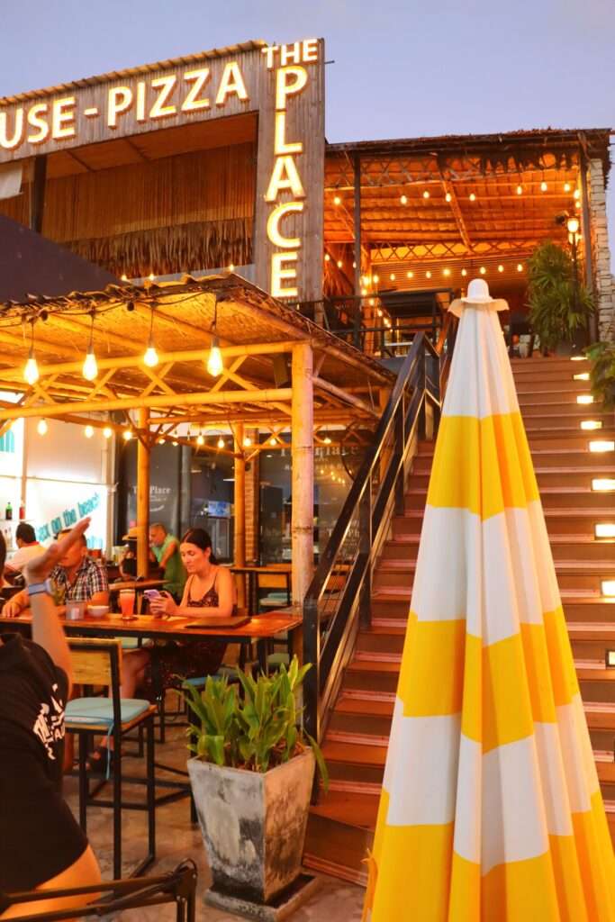 Lampions qui tremblotent, planches chauffées par la journée, odeur de bois et de basilic qui s’élève dès qu’on franchit la porte : la terrasse de The Place s’installe entre la mer et la nuit. Les nappes blanches prennent la couleur du couchant, les bougies découpent des îlots de chaleur, et la rumeur de Bangla reste en arrière-plan, comme un écho lointain.