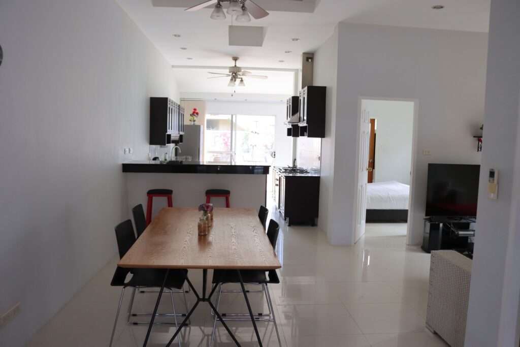 Après les routes animées du sud de Phuket, franchir la porte de notre villa réservée sur Airbnb marque une transition immédiate vers un rythme plus calme. Dès l’entrée, un petit porche couvert mène à une grande baie vitrée qui ouvre sur un intérieur lumineux. Nous posons nos valises et découvrons un espace simple mais fonctionnel : un vaste séjour aux sols carrelés brillants, une grande table en bois pour les repas, un salon confortable organisé autour d’un canapé rouge et d’une table basse, et, dans le prolongement, une cuisine équipée où tout est déjà prêt pour la vie quotidienne.